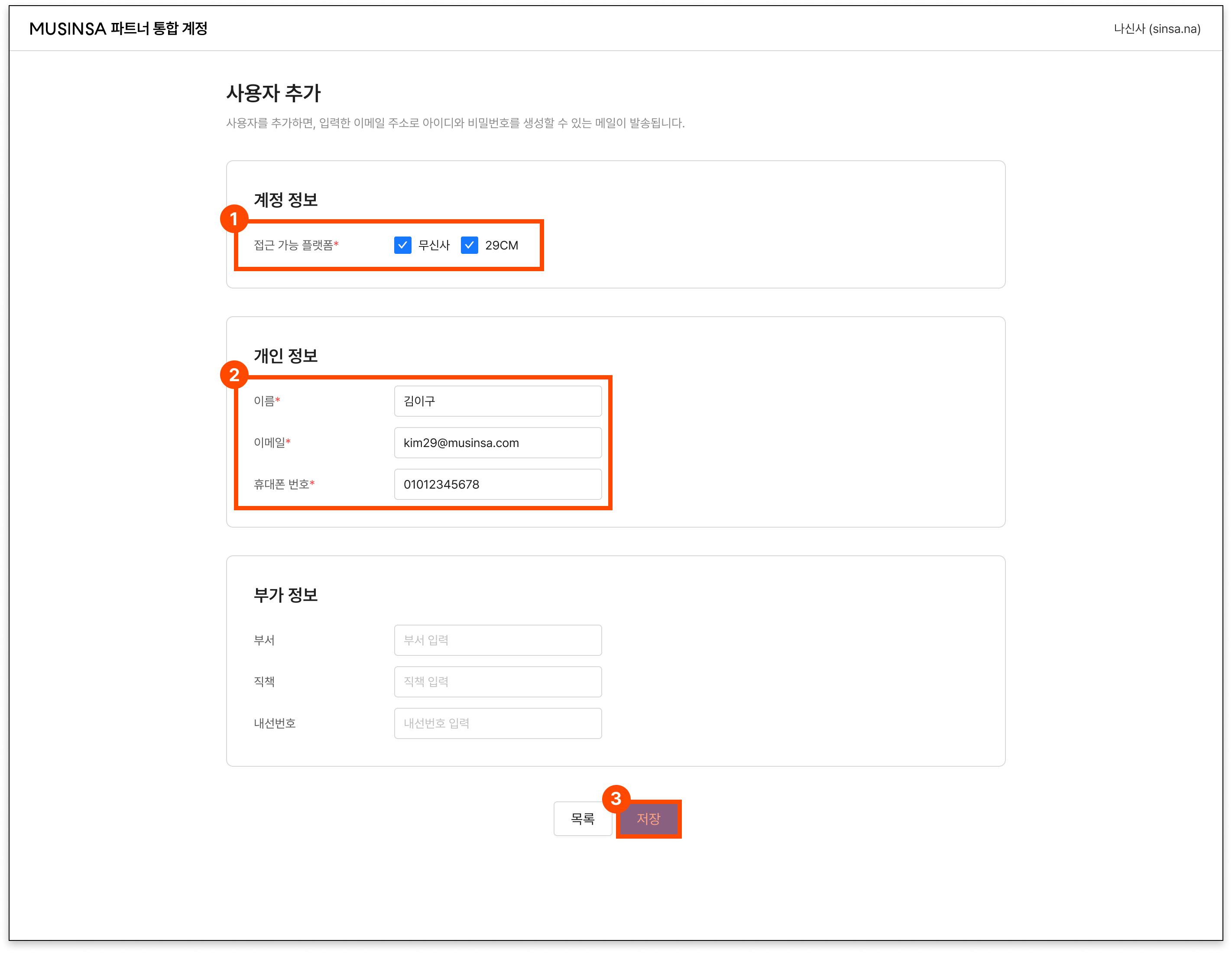 ③ [저장] 버튼을 클릭하면, 입력한 정보를 기반으로 계정 생성 안내 메일이 발송됩니다.