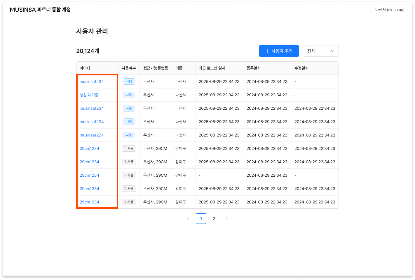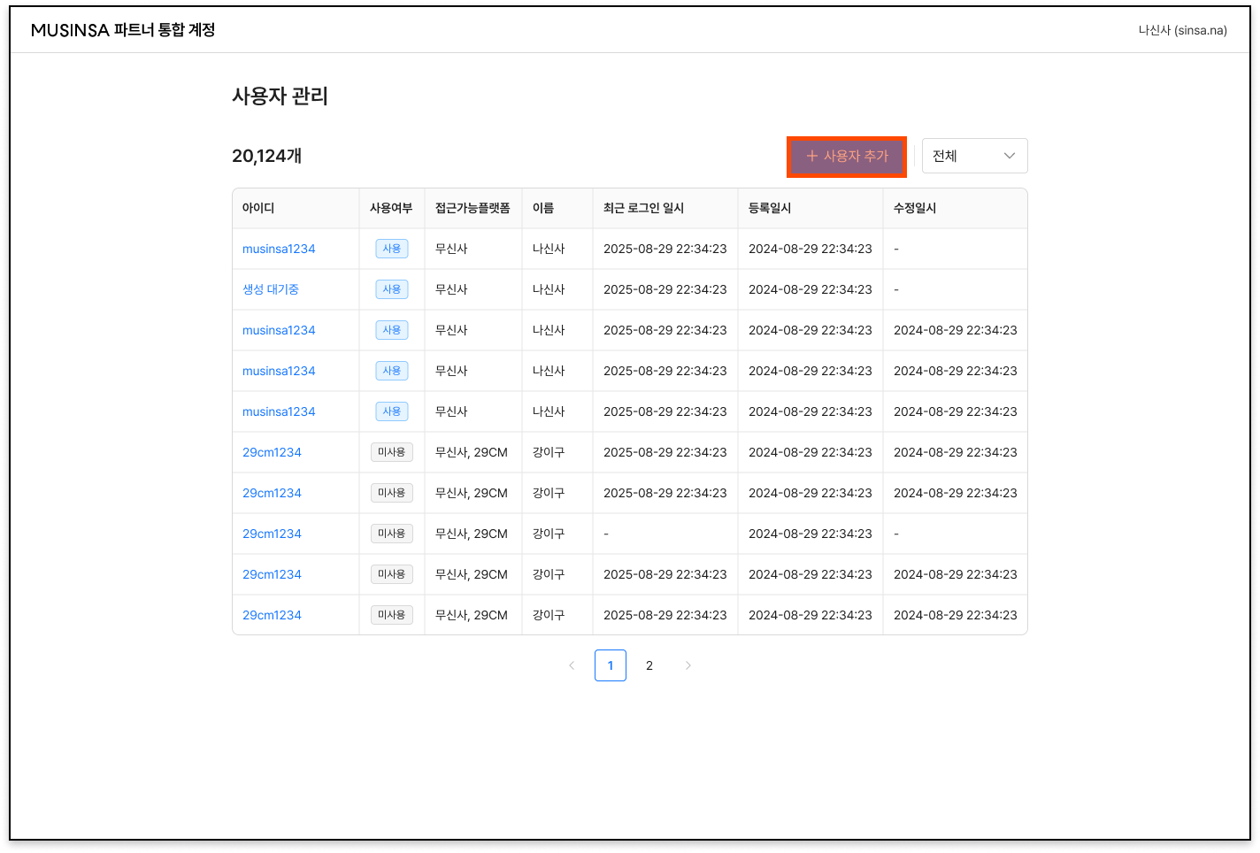 - 해당 메뉴에서는 사용자 정보를 수정하고 계정을 추가/삭제할 수 있습니다. (대표 관리자 계정에서만 노출)