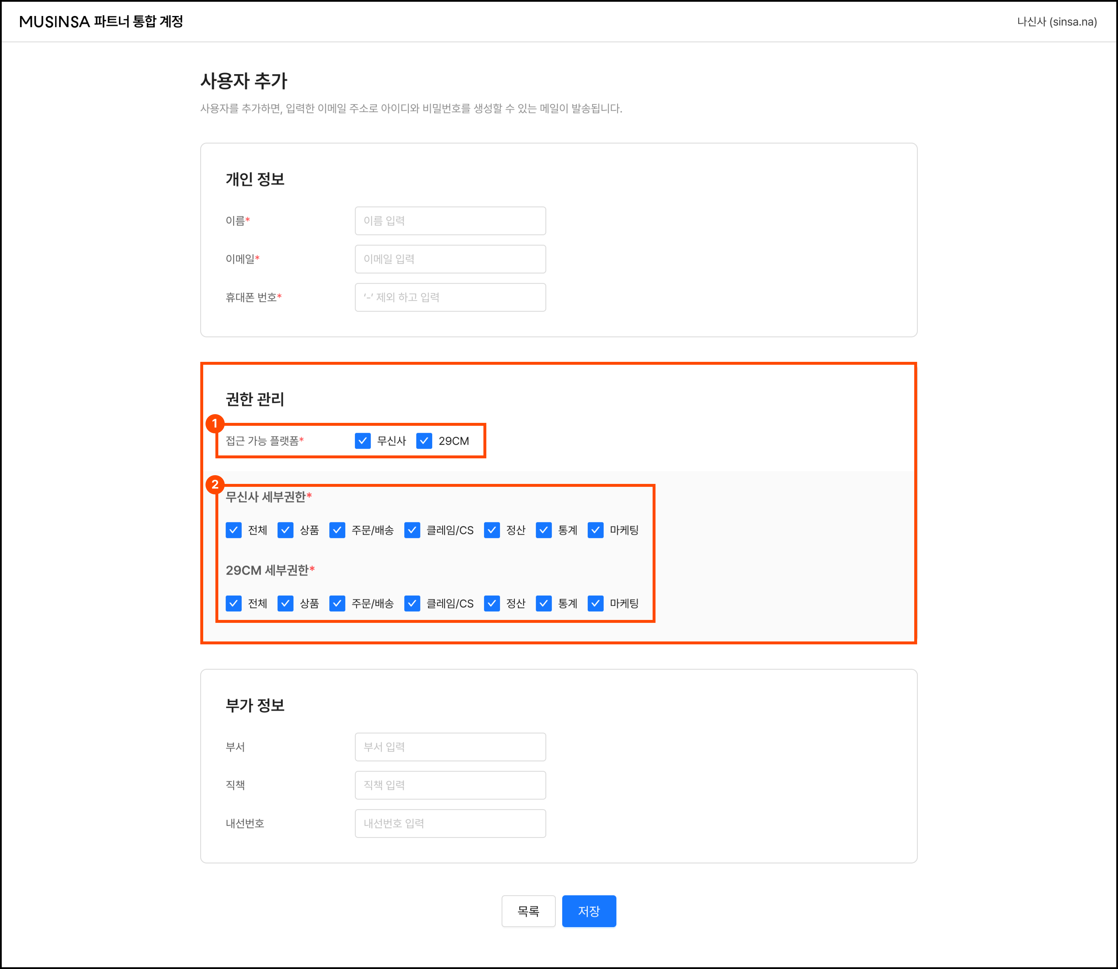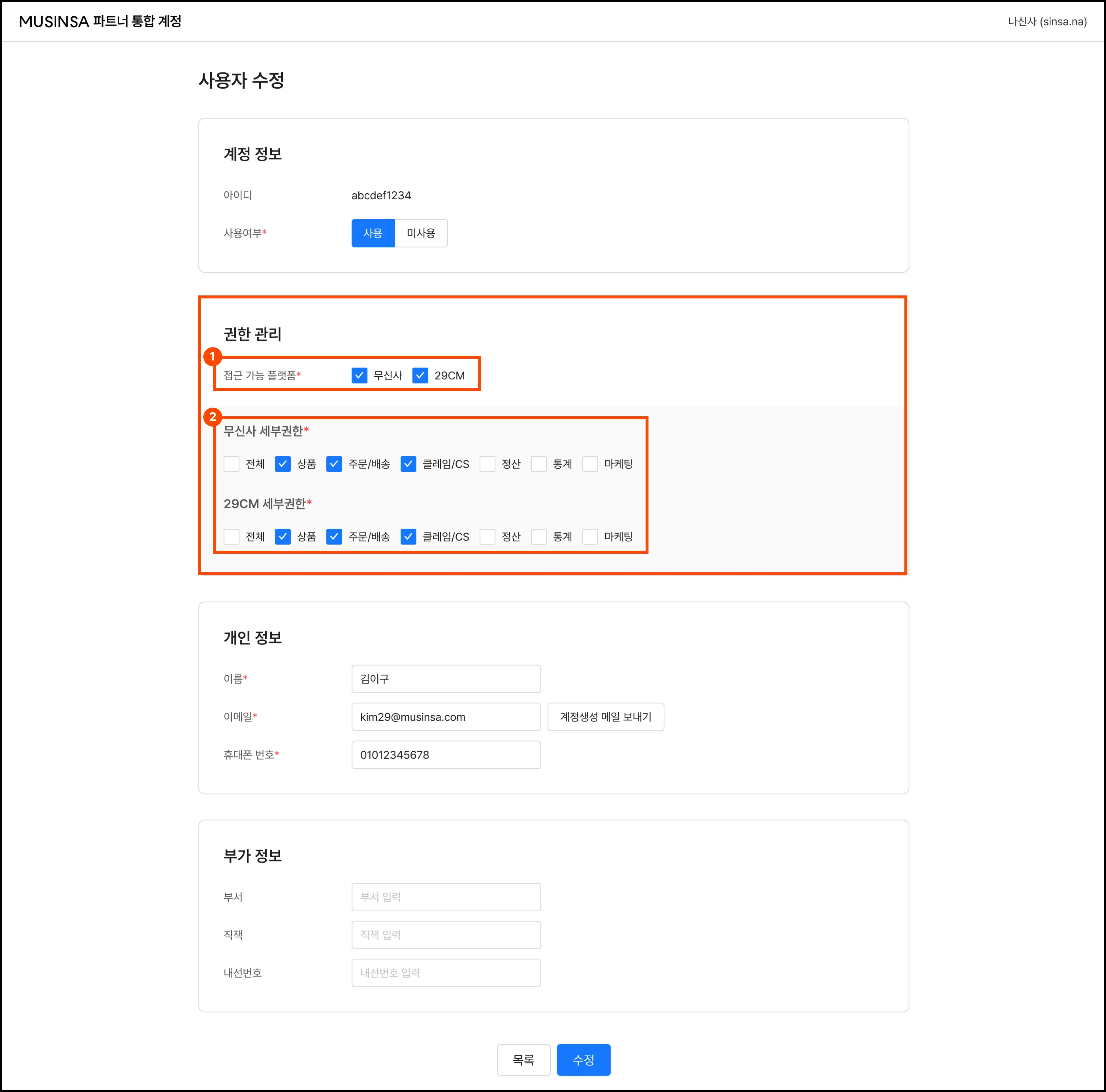 ① 접근 가능 플랫폼 설정: 해당 일반 계정이 접속하여 업무를 수행할 플랫폼을 선택합니다.