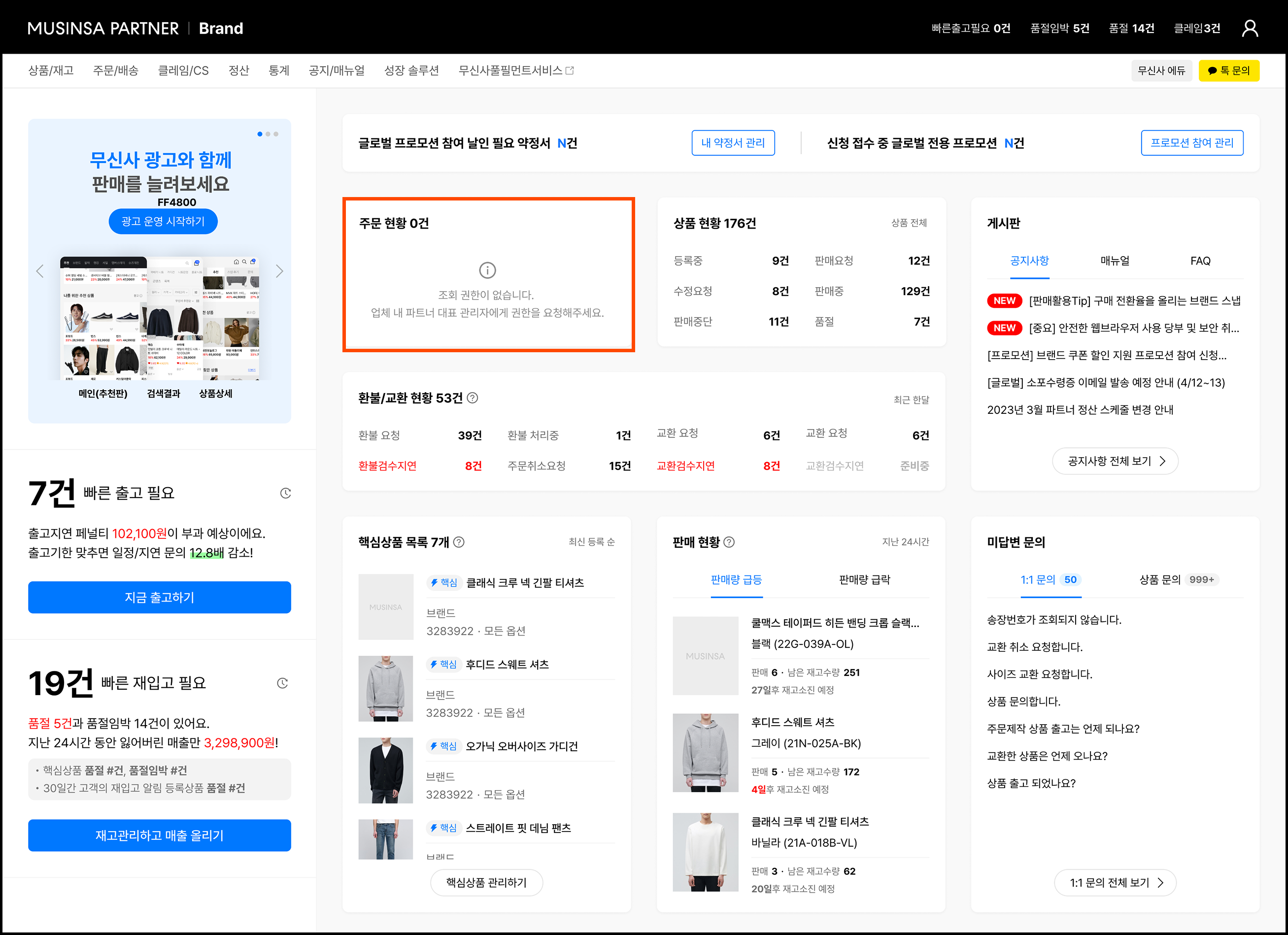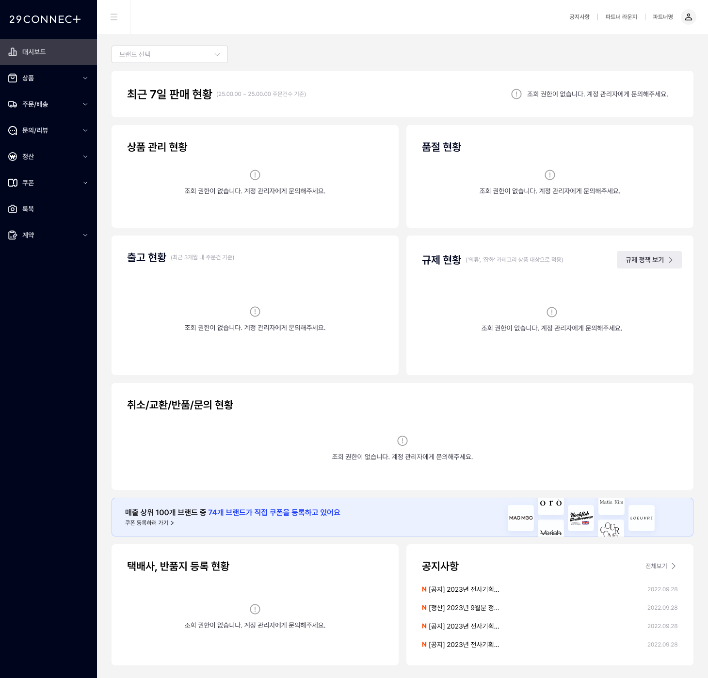 - 무신사 파트너 어드민 대시보드에 노출되는 각종 현황 데이터 또한 부여받은 권한에 따라 다르게 표시됩니다.