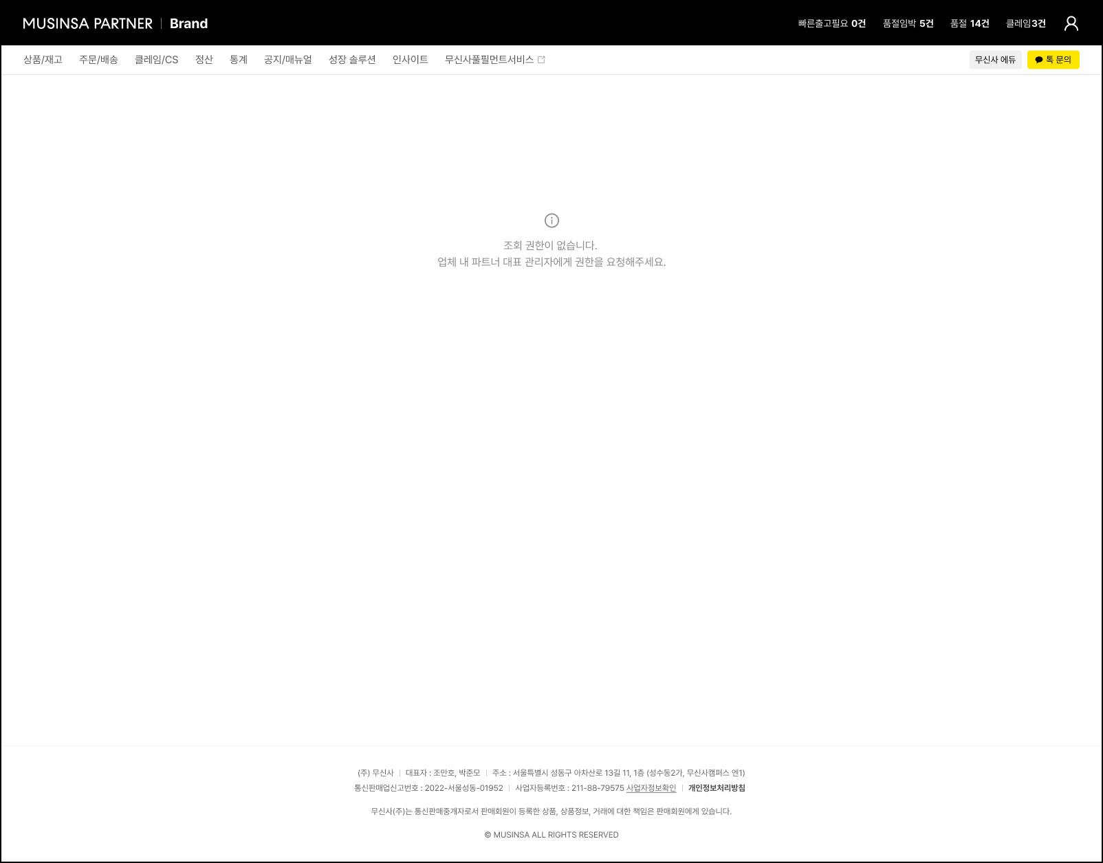 - 해당 메뉴의 접속이 필요한 경우, 업체의 대표 계정 관리자에게 권한 부여를 요청해 주시기 바랍니다.