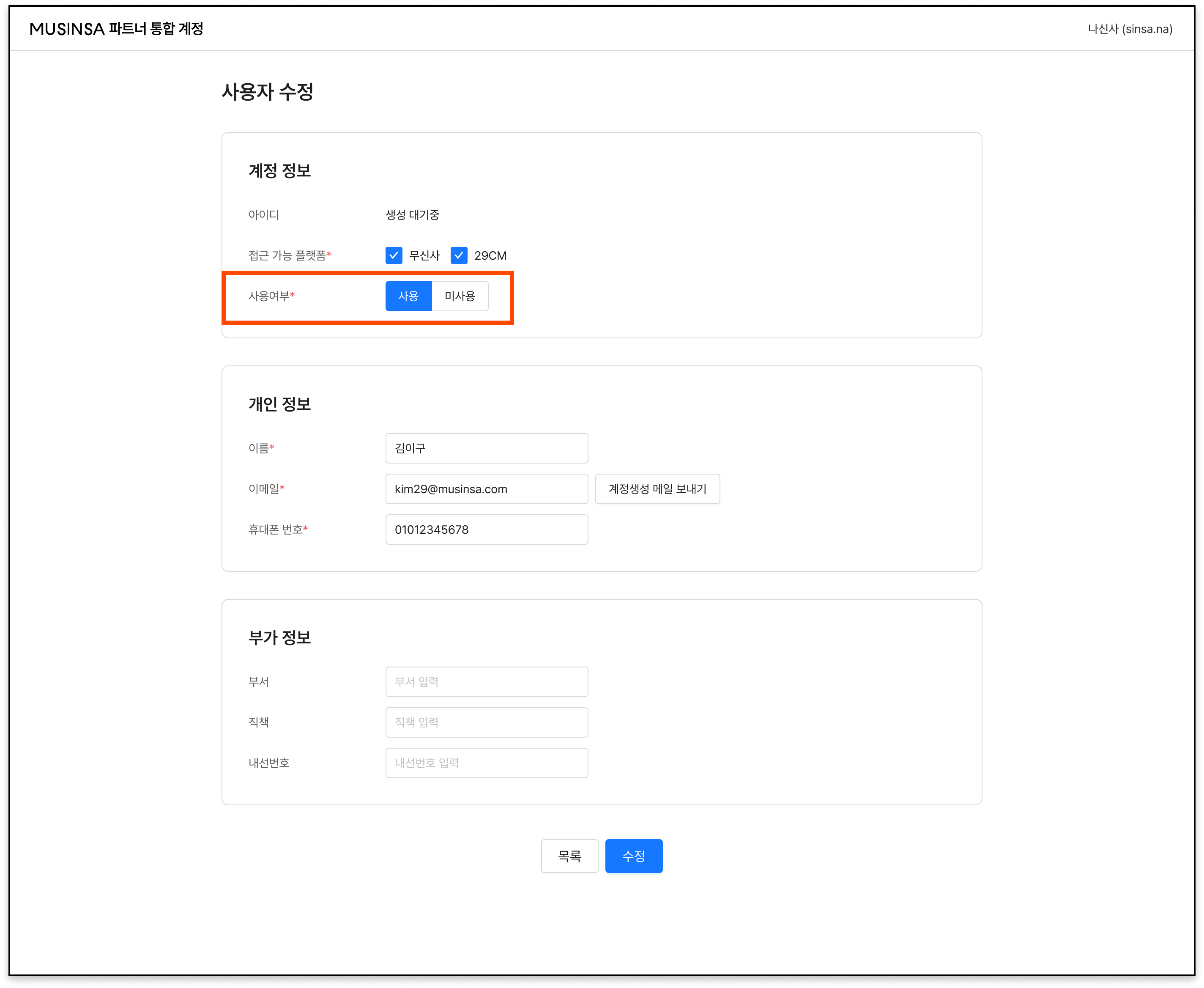 - 담당자 퇴사, 변경 등으로 계정을 삭제해야 하는 경우, 사용자 수정 > ‘사용 여부’ 항목에서 해당 계정의 활성/비활성 상태를 관리할 수 있습니다.