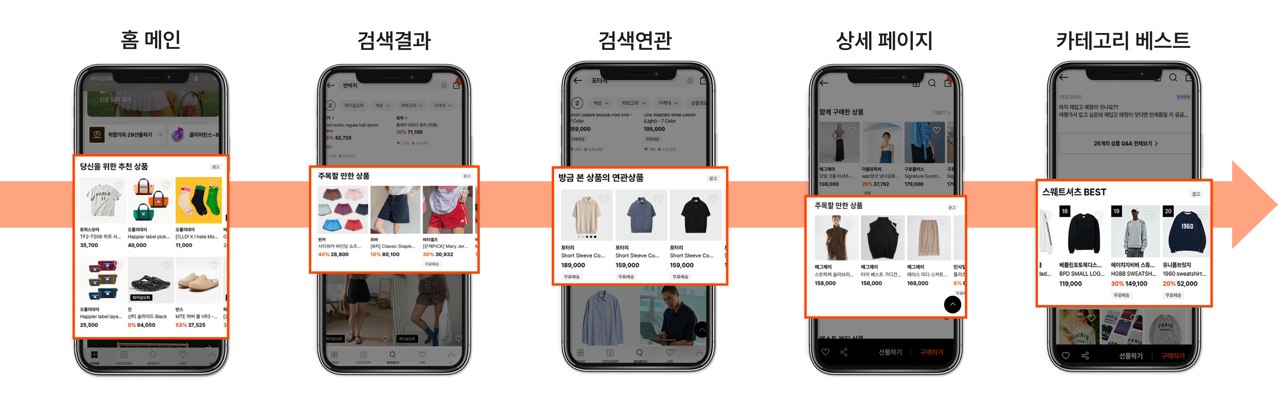 홈, 검색, 추천, 상세 페이지 등 고객이 쇼핑하는 여정 곳곳에서 상품을 반복 노출시켜,