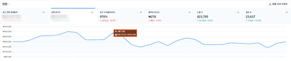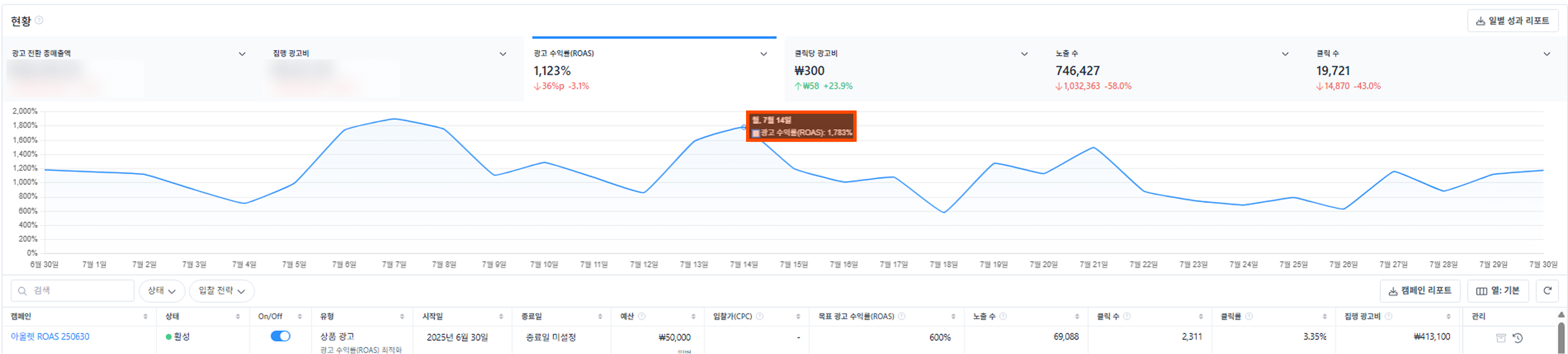 광고 수익률(ROAS) 탭을 클릭하면 광고 성과의 흐름을 한눈에 확인 할 수 있어서 편리합니다.