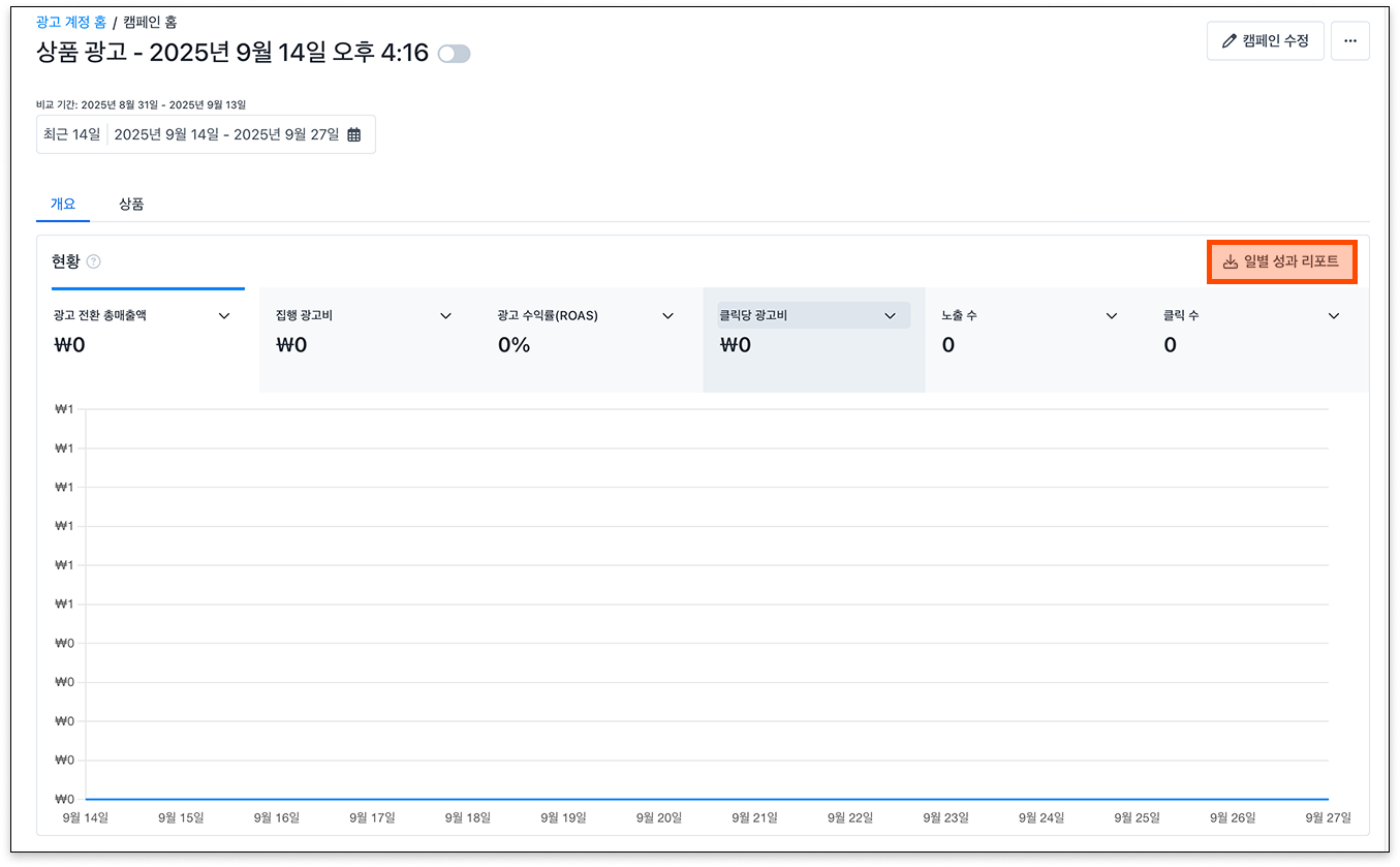 일별/기간별 성과 리포트📌 성장 솔루션 – 상품광고 – 대시보드 - 일별 성과 리포트 다운로드 |