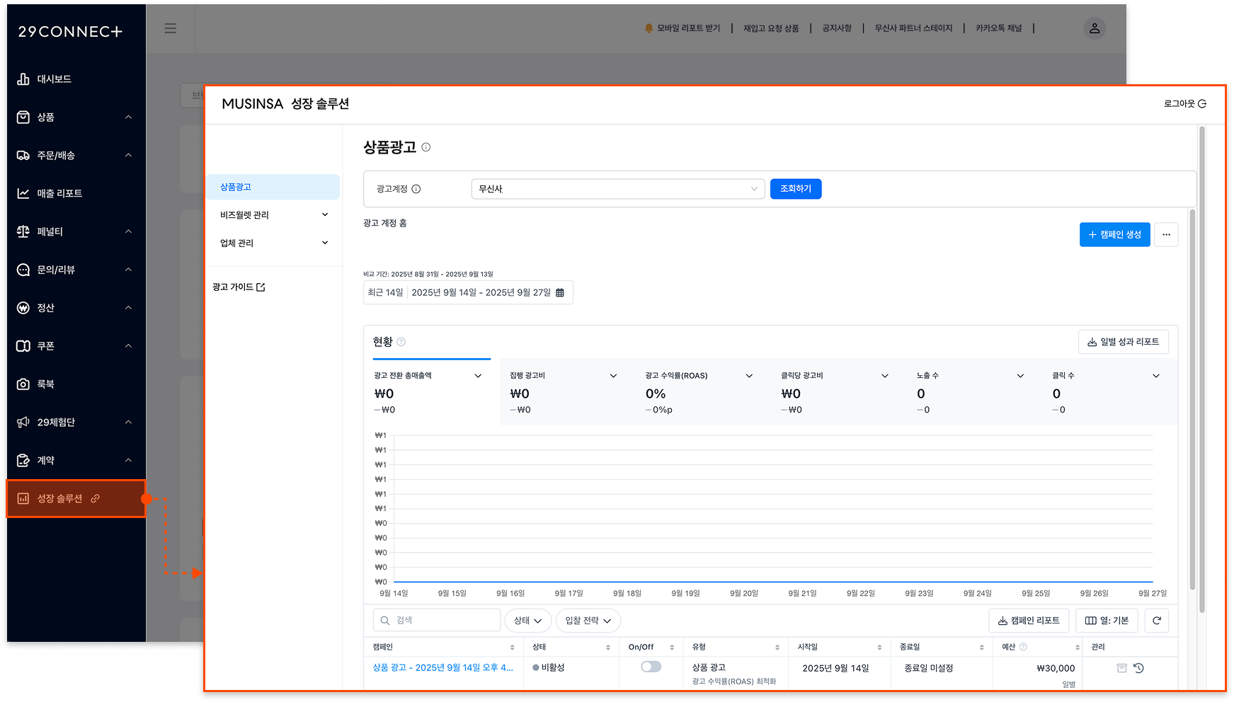 가장 먼저 29Connect > 성장 솔루션에 접속해 주세요.