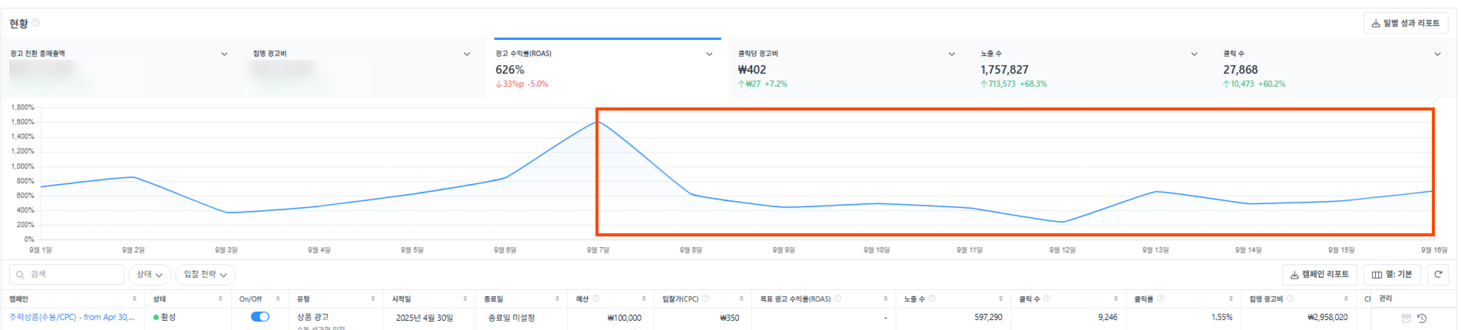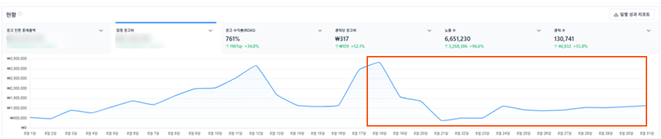 - 광고비는 지출되지만, 매출 성과가 나타나지 않아 광고 ROI 악화