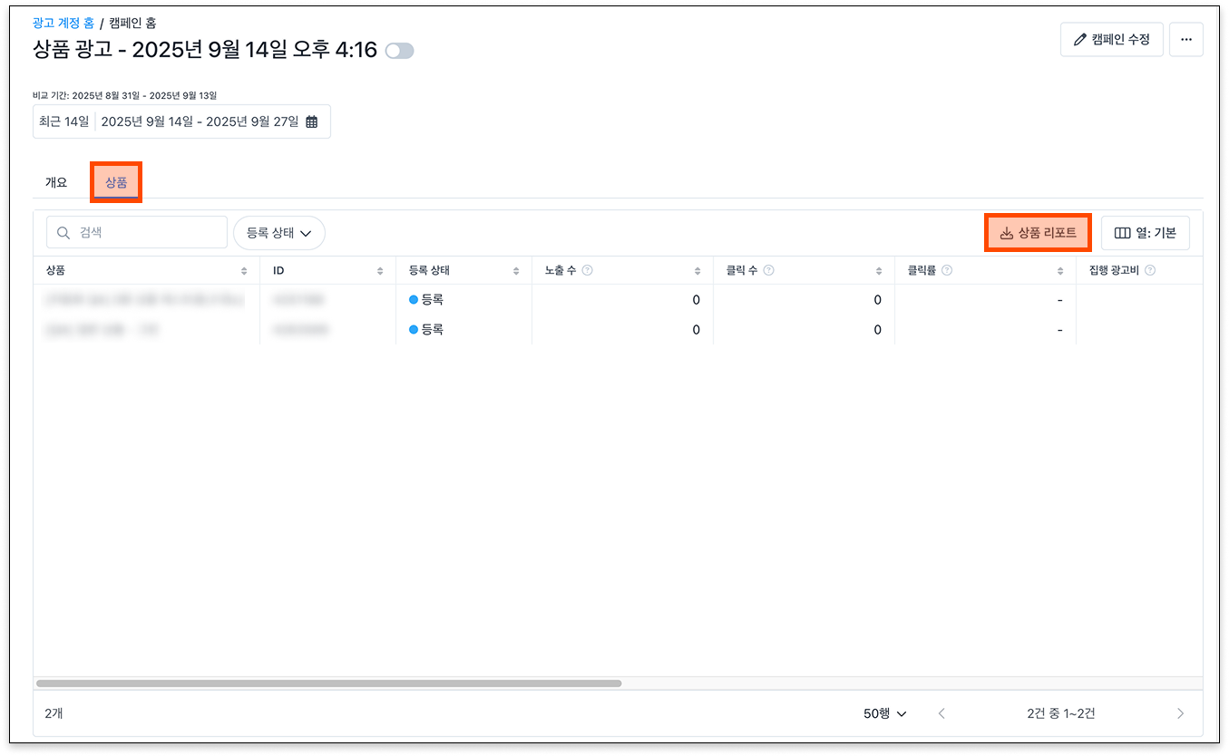 제품별 성과 리포트📌 성장 솔루션 – 상품광고 – 대시보드 - 캠페인 클릭 - 상품 탭 - 상품 리포트 다운로드 |