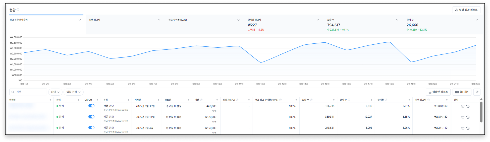 이제 광고 구조와 각 지표의 의미를 이해했으니, 실제 대시보드에서 광고 운영 상태를 점검하고 관리하는 방법을 살펴보겠습니다.
