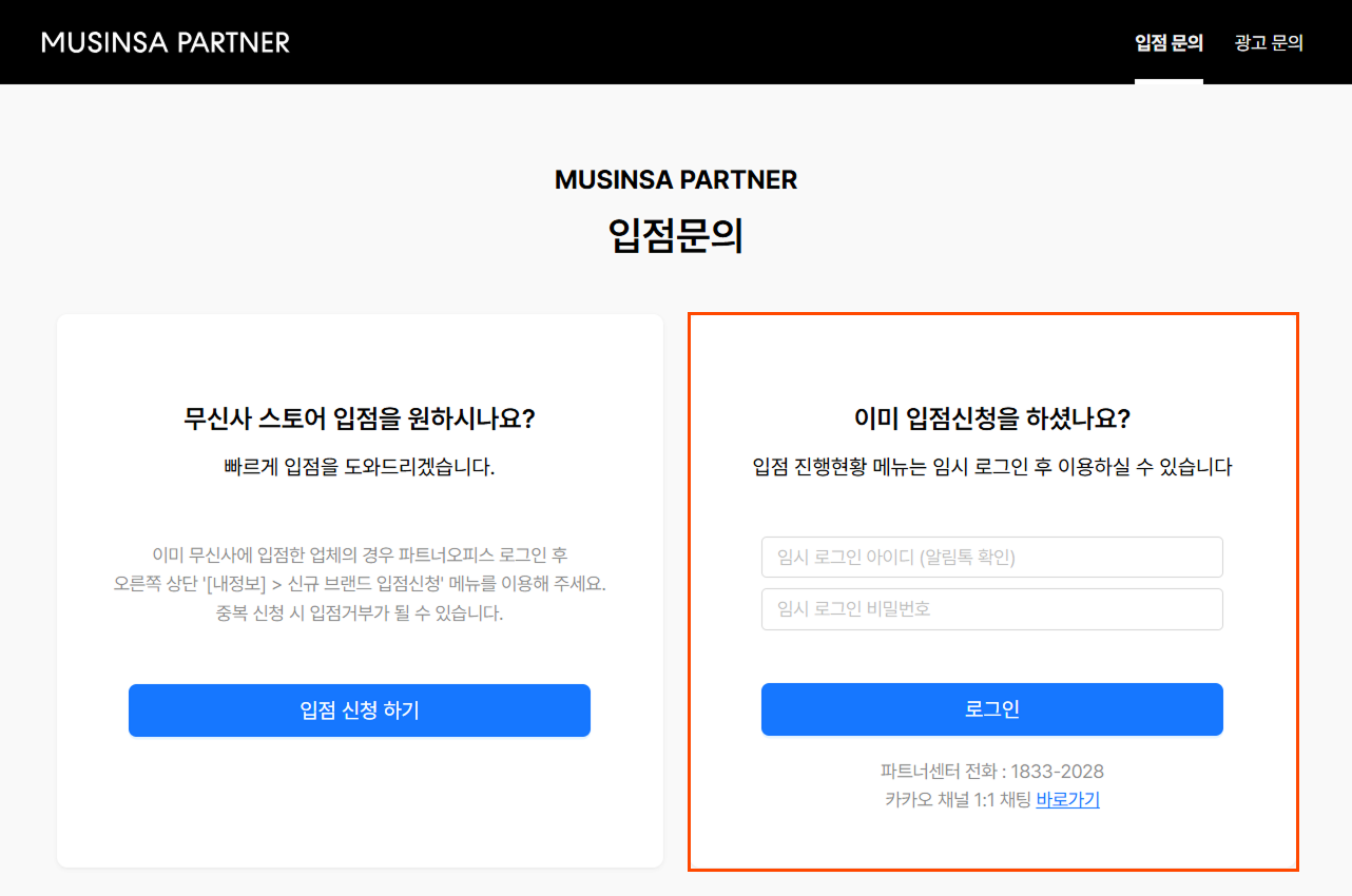 | 1. 입점 신청 시, 발급된 임시 ID/PW를 활용해 입점 자료 등록 단계로 넘어갑니다. |