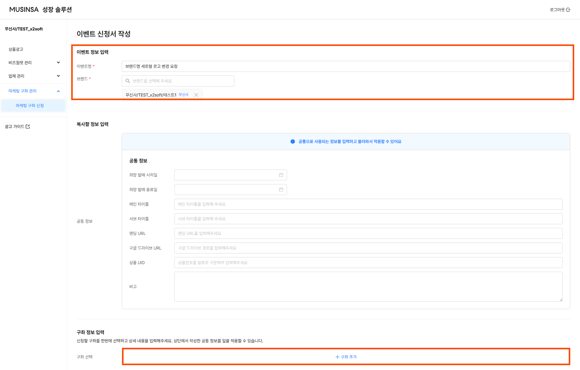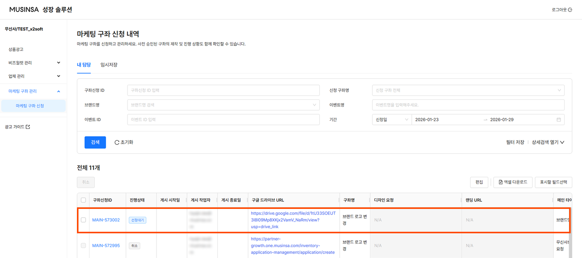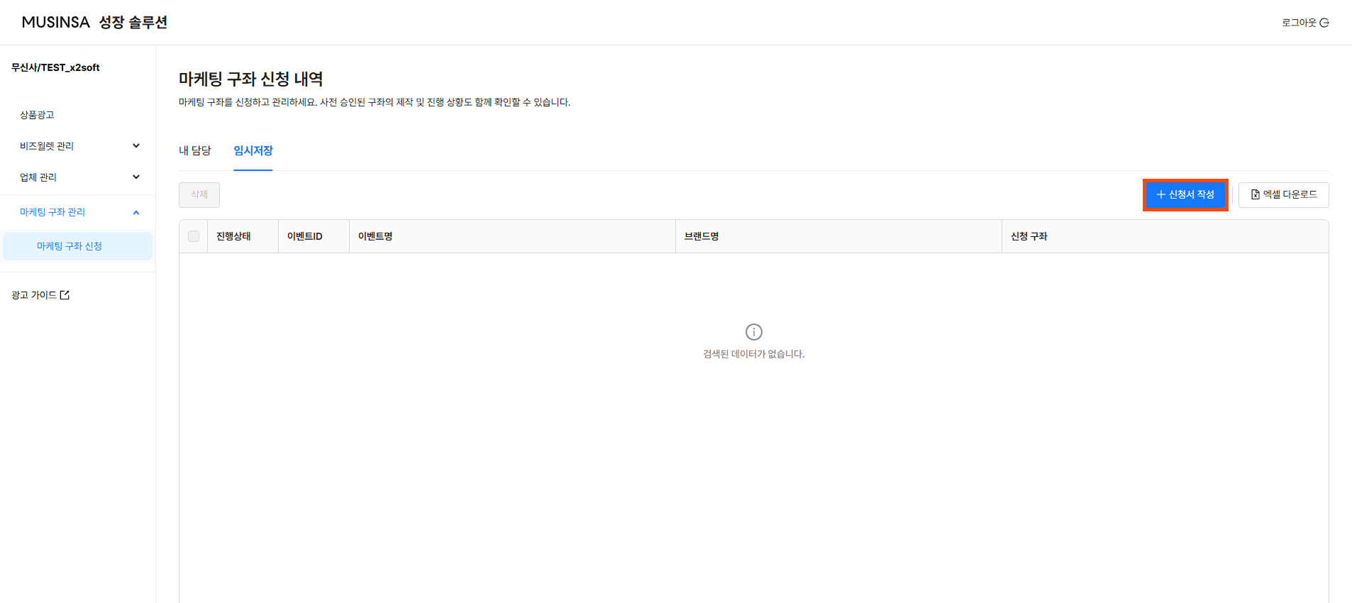 📌 경로: 파트너 어드민 > 성장 솔루션 > 마케팅 광고구좌 관리 > 마케팅 구좌 관리 > 마케팅 구좌 신청