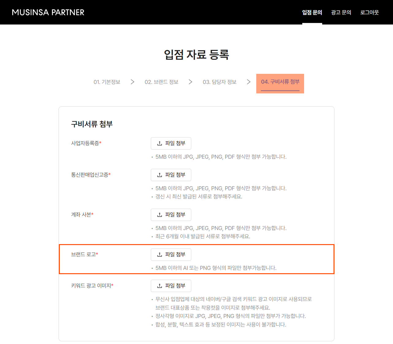 | 2. 구비서류 첨부 단계에서 브랜드 로고 파일을 등록합니다. |