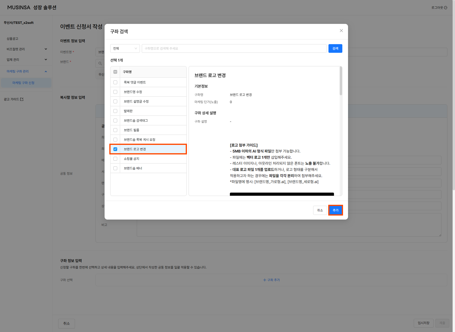 | 3. [브랜드 로고 변경]을 체크한 뒤 추가를 클릭합니다. |